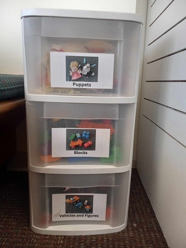 Clear drawers with laminated pictures of what goes in them can be effective, as can